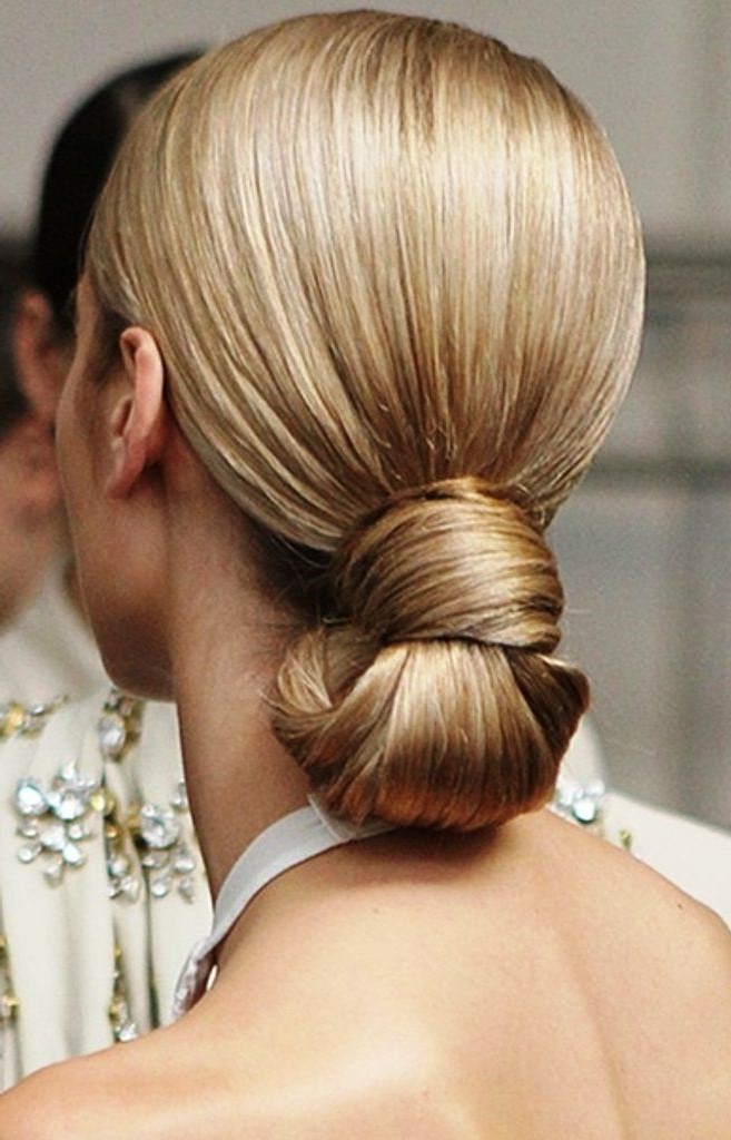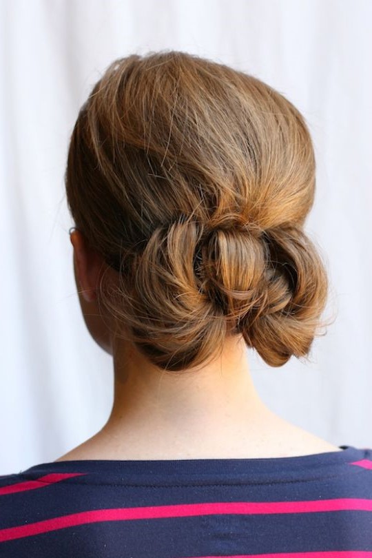 This kook has volume at the crown and a chignon that is tucked under, giving it an old school look. The key is a high quality brush and bobby pins. First, father the top section of your hair (from your hairline to the crown) and tease it with a boar bristle brush. Then, smooth the top layer with the brush and pull hair into a ponytail so it lines up at eye level. Now, gather the rest of your hair into a second ponytail underneath the first, finally combining the two and teasing the layer beneath. Roll the ponytail onto the nape of your neck, criss crossing bobby pins to secure and setting with hairspray to maintain volume.