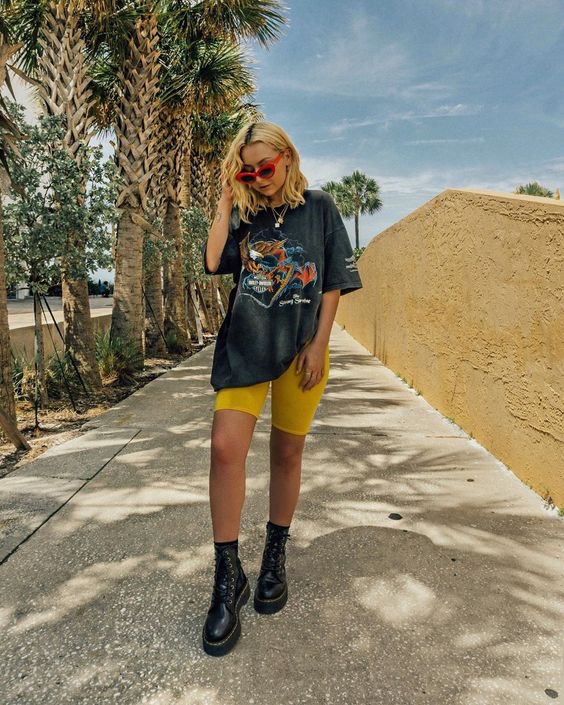 If summer is over but winter hasn’t yet arrived, celebrate autumn with a neutral-colored slouchy sweater and a pair of chunky ankle boots. The softer shades will balance out black biker shorts but also look great with biker shorts of other colors. The ankle boots add a more polished look.