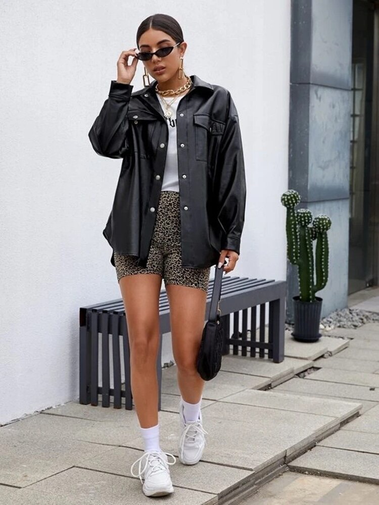 Going to a concert or drinks with friends? Show off those dangerous curves in a more unexpected way – with printed biker shorts. Leopard print shorts and a black leather jacket will always be a timeless pairing that’s elevated but a little wild. Underneath, show a little skin with a white tube top or bandana top.
