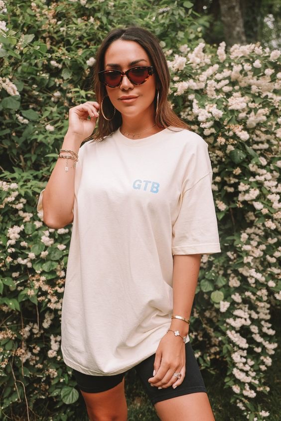 This look is easy breezy Kardashian chic and we’re loving it. Opt for an oversized tee (off-the-shoulder looks great too) and pair it with some statement hoops. Biker shorts of any color will look stunning with this outfit. It also looks great with a slicked-back hairdo, ponytail or loose waves.