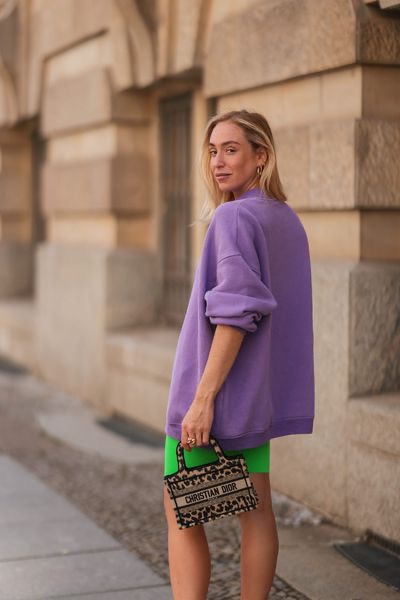 Channel your inner Princess Diana with this 1980s streetwear style. A baggy vintage sweater is oh so soft and looks great with a pair of snug biker shorts, chunky white crew socks and sneakers.