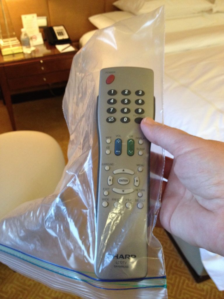If you don’t want to get pinkeye, it’s best to cover up that remote control with plastic shield. The bacteria hiding on a hotel room remote will keep you up late at night, so we won’t go into details. But honestly, how many cleaning staff do you think are diligently wiping down remotes between stays?