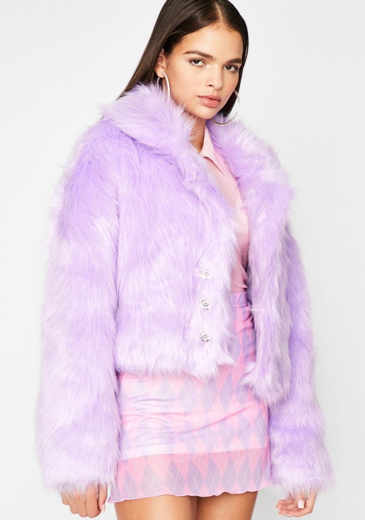 For the rebel girl who still wants a touch of femininity, this plush lilac look is one that Cardi B would be proud of. It’s cropped and perfect for a short dress and thigh highs.