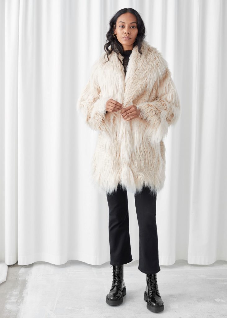 You’ll feel like Kate Hudson in Almost Famous when you slip on this shaggy off-white coat. Shag just adds an effortless level of cool girl to any ensemble, but we suggest it with your hair down and some combat boots.
