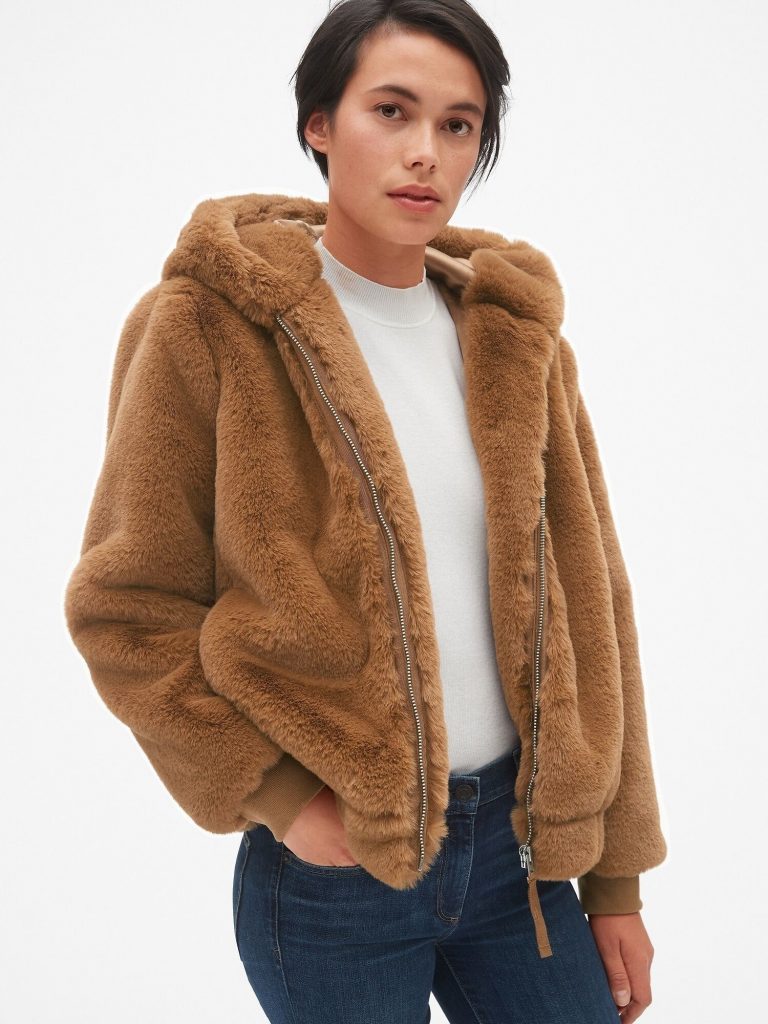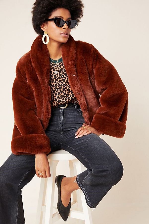 This fur coat has a hood, which is basically permission to wrap a blanket around your entire upper body. It stays chic and not too shabby with the neutral color palettes of brown and icy gray. It hits right at the hip with a relaxed fit perfect over jeans and a tee.