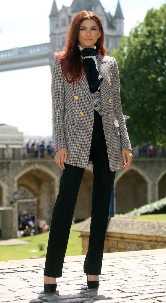 This is Zendaya’s London look for the Spider-Man premiere, and was it fitting! The master of the pantsuit is back – seriously, how does she pull off these things? It must be those legs that go for miles. A dramatic necktie paired with a sleek and sophisticated power suit makes the commanding Coleman look like a CEO instead of an actress.
