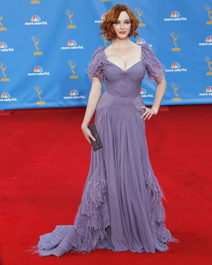When you look directly at Mad Men star Christina Hendricks, it’s kind of like looking directly at a brilliant phoenix. Posen took that bird metaphor to flight with this gorgeous off-taupe look that pays homage to Joan Crawford and her era of stars. The feather detailing on the sleeves and towards the train is just the right amount of subtle.