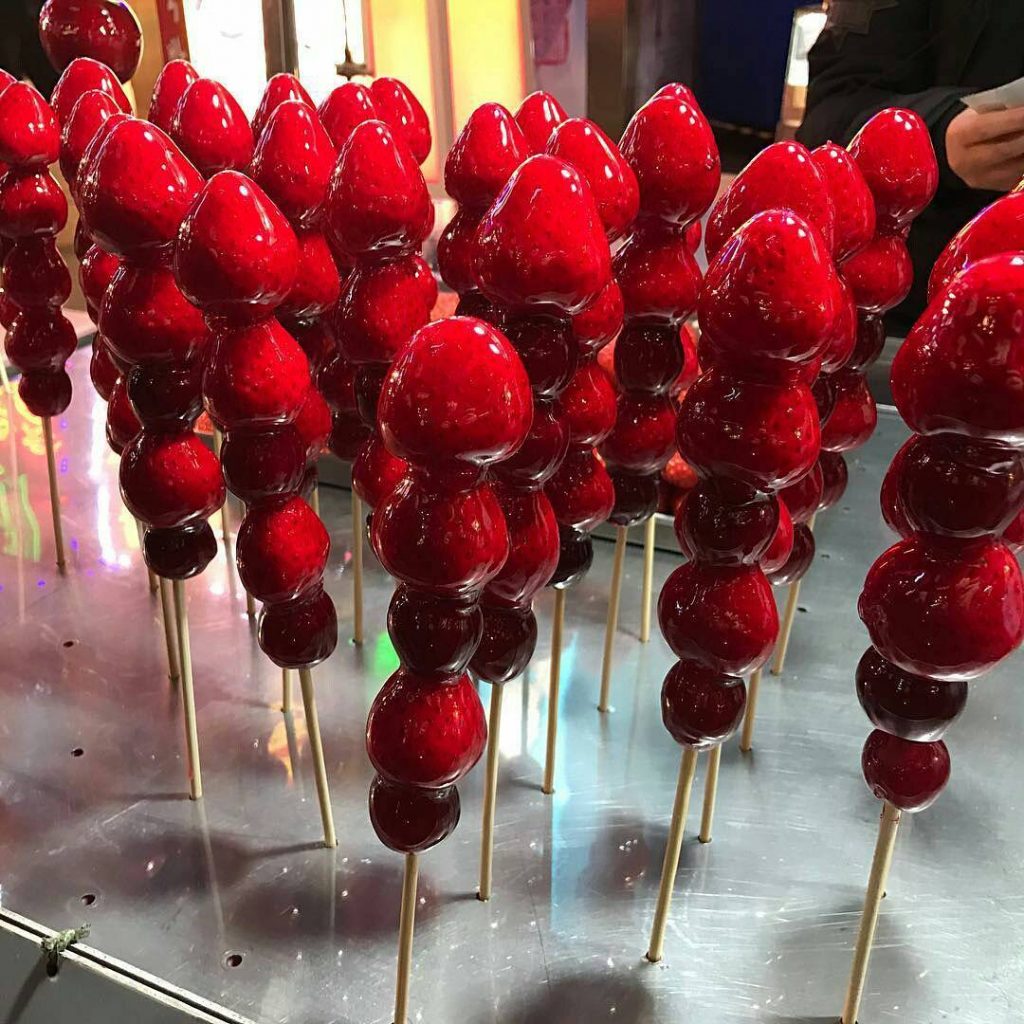You can often find caramelized strawberries sold in the streets in winter. It is considered a classic winter dessert. It definitely looks yummy!