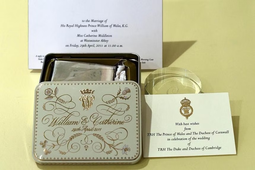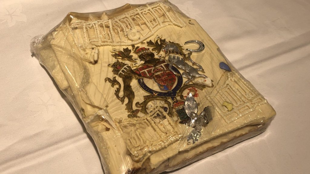 One is nicely wrapped in ribbon and protection and says “Lady Diana Spencer” on it. The other, which is still relatively intact, was displayed in this YouTube video unboxing the preserved fruit cake.