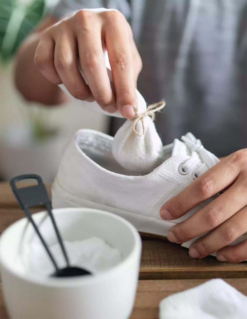 Smelly shoes can be a real issue, but there is an easy trick you can use anytime. Baking soda reduces all kinds of bad smells and will make your shoes odourless in no time. You can put some baking soda right inside your shoes and let it sit there for a day before throwing it out. You can also create special sachets or small pouches made out of textile or socks. Fill them up with baking soda and put inside your shoes.
