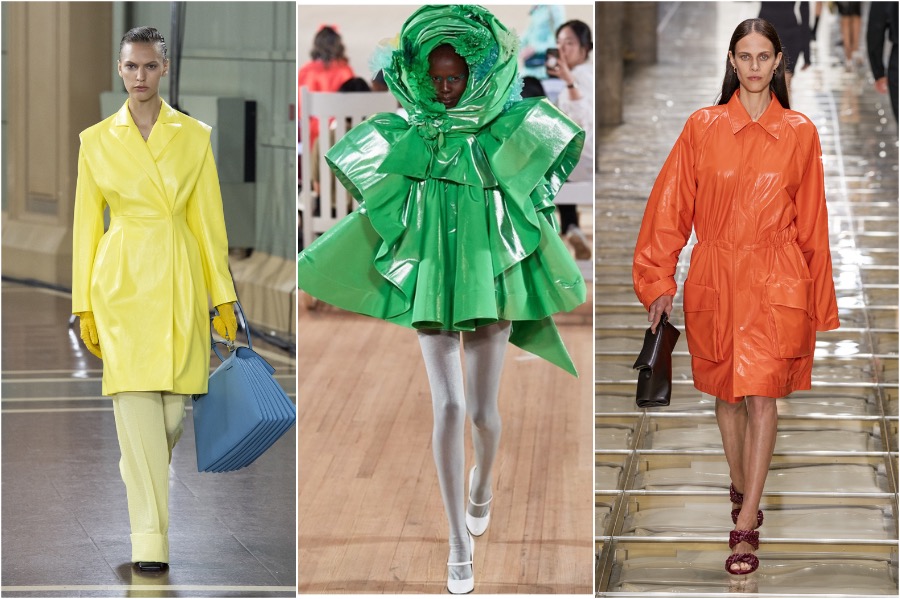 Most of us, when we think of leather we think black, sometimes brown and on rare occasions white. But generally, we’re used to natural earth tones when it comes to leather jackets. Well, first of all, leather is kind of passee unless it’s vintage and vegan leather has replaced it in many cases. And secondly vegan leather is going rainbow this spring. Bright colors and monochromatic looks are looking super trendy. All green leather look? Shades of yellow with a vegan leather coat? Marni, Prada, Bottega Veneta all say yes to that.