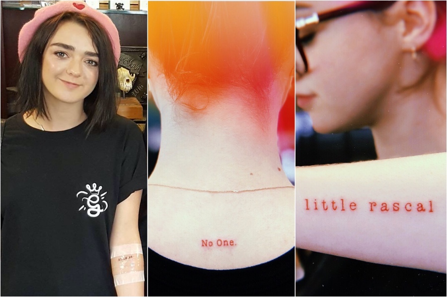 Maisie has 6 small tattoos on her body. The most famous one is probably the date 07.08.09 tattooed on her arm in red ink. It’s a matching tattoo she has with her BFF Sophie Turner to commemorate the date they were cast in GOT. She also has a tattoo on the back of her neck that says “no one”, a tattoo that says “little rascal” on her arm, and the number 79 on her inner arm, all of them in red ink. She also has a small sunflower on her upper arm, small Japanese Kanji on her ankle that apparently means “adventure”, and 4 Japanese symbols on her ribcage for ikigai, which is roughly translated as “reason for being”.