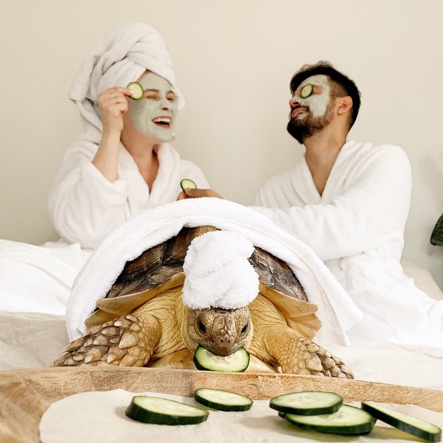 2. We all need a spa day once in a while – even creatures with shells need a day off. Here is Ethel matching her mom with an adorable towel turban. While mom and dad are putting cucumbers on their eyes, Ethel has decided that hers are much more useful in her noisy little mouth.