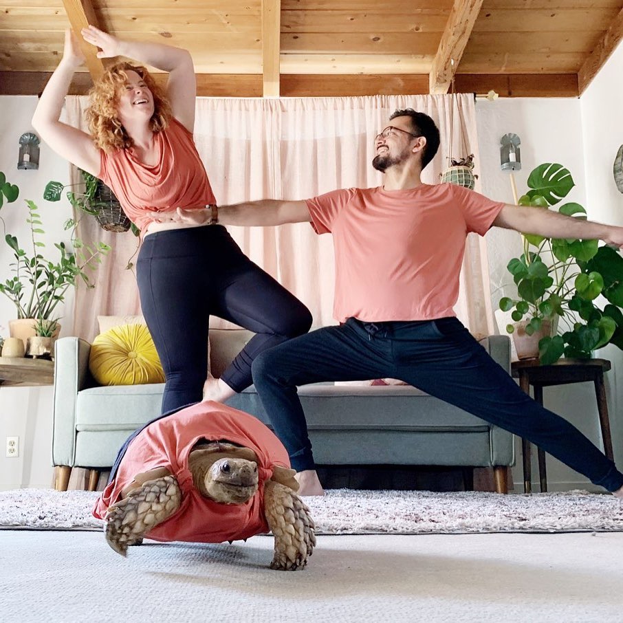 3. Welcome to Ethel’s yoga day. Everyone wears matching coral shirts, but Ethel has some extra sweet knots around her shoulders to keep that fabric out of her face. This pose is called one-arm-tortoise, obviously.
