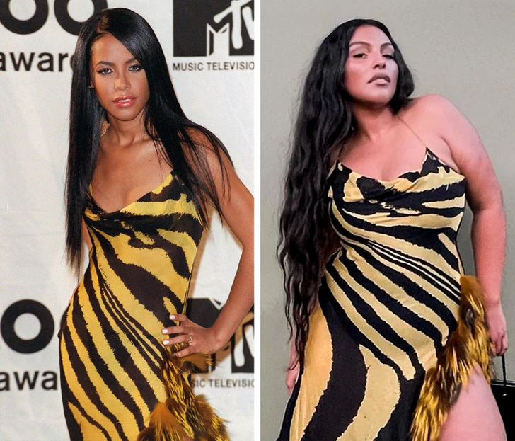 5.Paloma Elsesser recreated Aaliyah’s look in this gorgeous tiger striped dress. Animal print is for everyone and we think it looks equally amazing on both ladies.