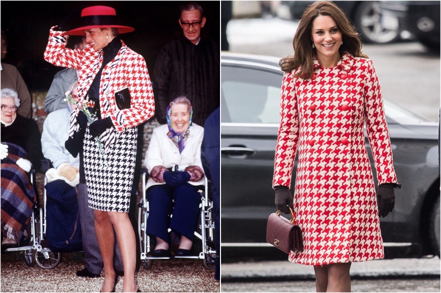 1. Houndstooth has been a popular pattern for a long while now. It’s one of those classic things that never really go out of fashion. But we rarely see it in red, usually, it’s just black and white. So it’s really interesting that both Diana and Kate chose to wear this pattern in red.