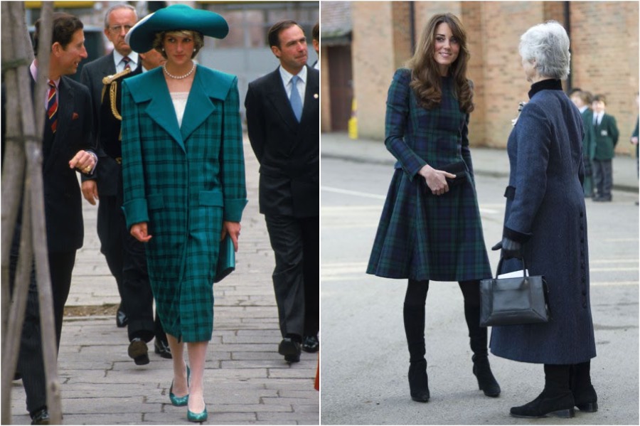 8. Diana’s green tartan coat looks like such a statement, but you have to remember that such wide shoulders were a trend in the 80s. And of course, here’s Kate wearing a much more tailored dress/coat in 2012 in the same print and color.