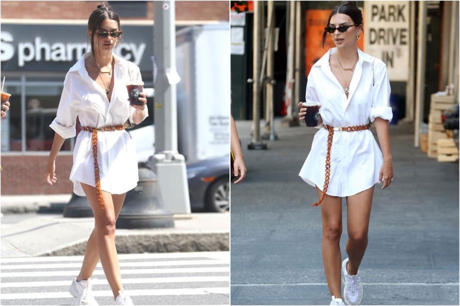 10. And finally, this white dress was the cutest thing we’ve ever seen Emily wear. She usually goes for more provocative outfits or very tomboyish looks. This dress seemed like the epitome of femininity on Emily Ratajkowsky and it looks so freaking stunning. Paired with white sneakers, brown bag and some brown tinted sunglasses and her tan skin – this is the ultimate summer look.