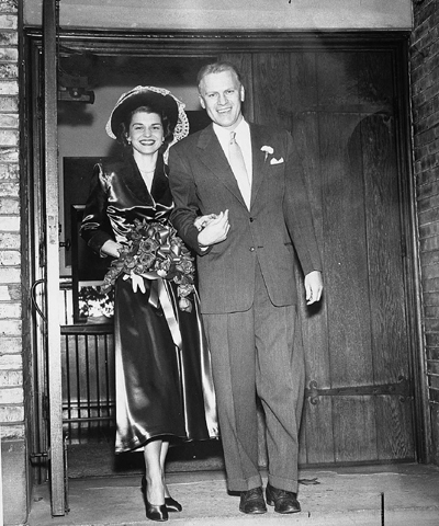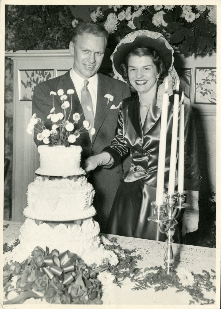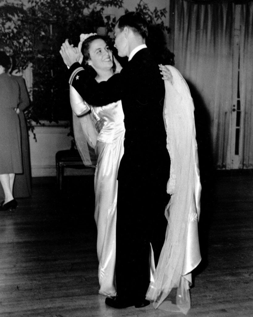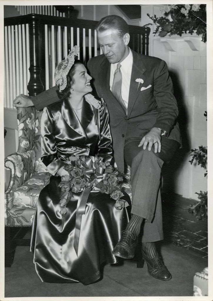 Betty wore a pretty blue dress for her wedding, taking the “Something blue” saying to a new level. The dress was made of satin and featured blazer-style lapels. While it’s unique, you could find something of a similar style in a more mainstream thrift shop today. We love that she went with such a unique look and silhouette.