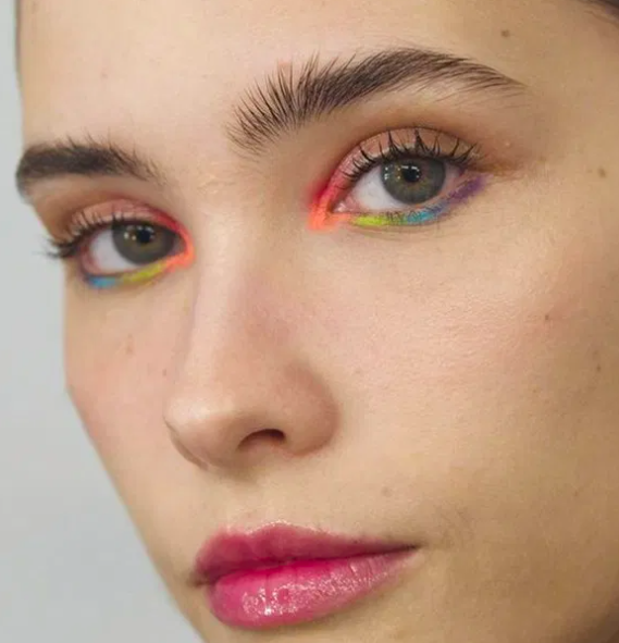 10. A fun interpretation of the graphic liner that we love is the pop of color on the inner, lower eyelid, with an otherwise barefaced look. The coral tone this model chose is a fantastic color option, but you can also play with pastels or jewel tones.