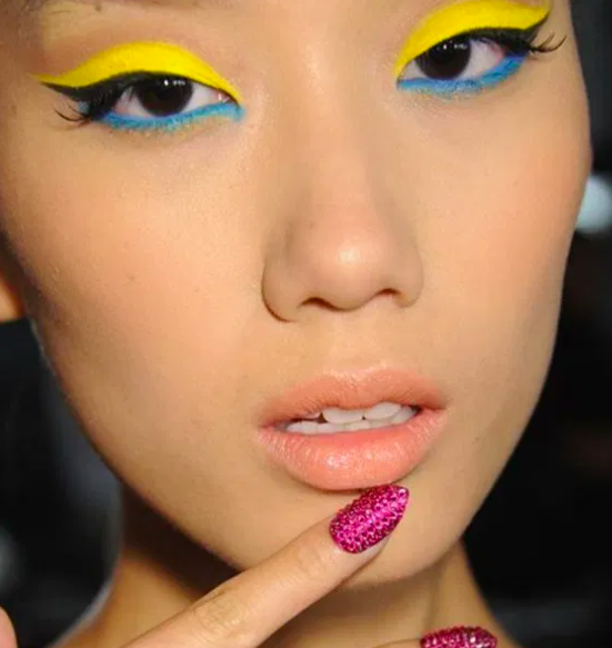 9. A three-toned eyeliner look sounds too extra in theory, but we’re in love with the execution in this look. The canary yellow and ocean blue are merged by a swooping black wing that hugs half of the upper eyelid. Add mascara to lengthen those lashes and maximize this look. Pair it with a nude lip and a sassy manicure like this model has for a fool-proof summer look.