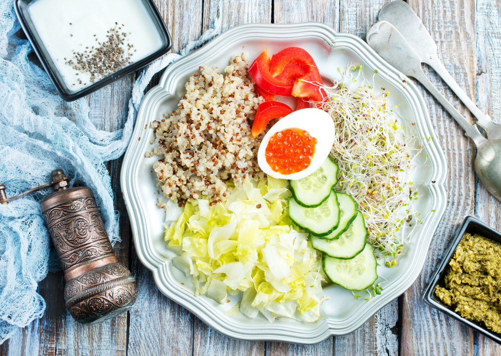 Salad is your best friend! You can fill it with cool and nutrition ingredients filled with refreshing textures. Many salads also contain hydrating greens which is helpful.