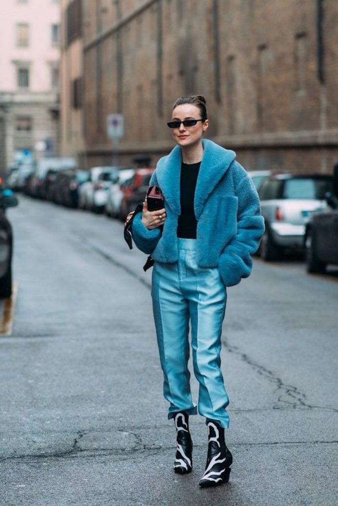 5. A good way to make a one-tone look stand out even more is to experiment with cuts and shapes. You can make a fluffy cosy coat look chic by combining it with high boots a classy leather bag and a down to business sleek bun hairdo.