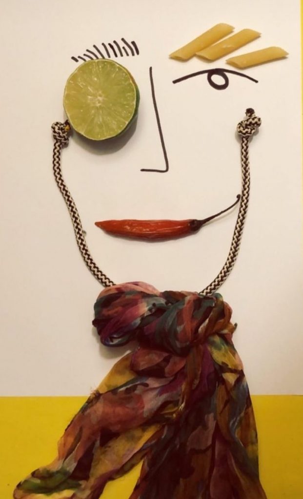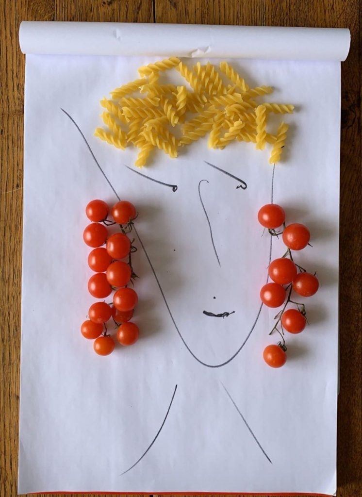 1. This is one of the first examples that Simon made himself. Call this one a deconstructed take on pasta. Around a roughly sketched face, wavy hair is made out of pasta noodles, while cherry tomatoes make for some gorgeous dangling earrings.