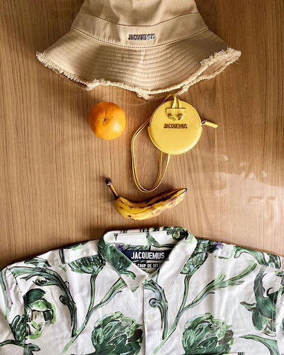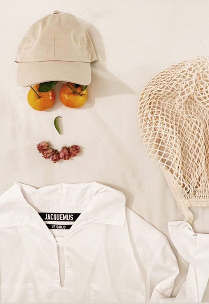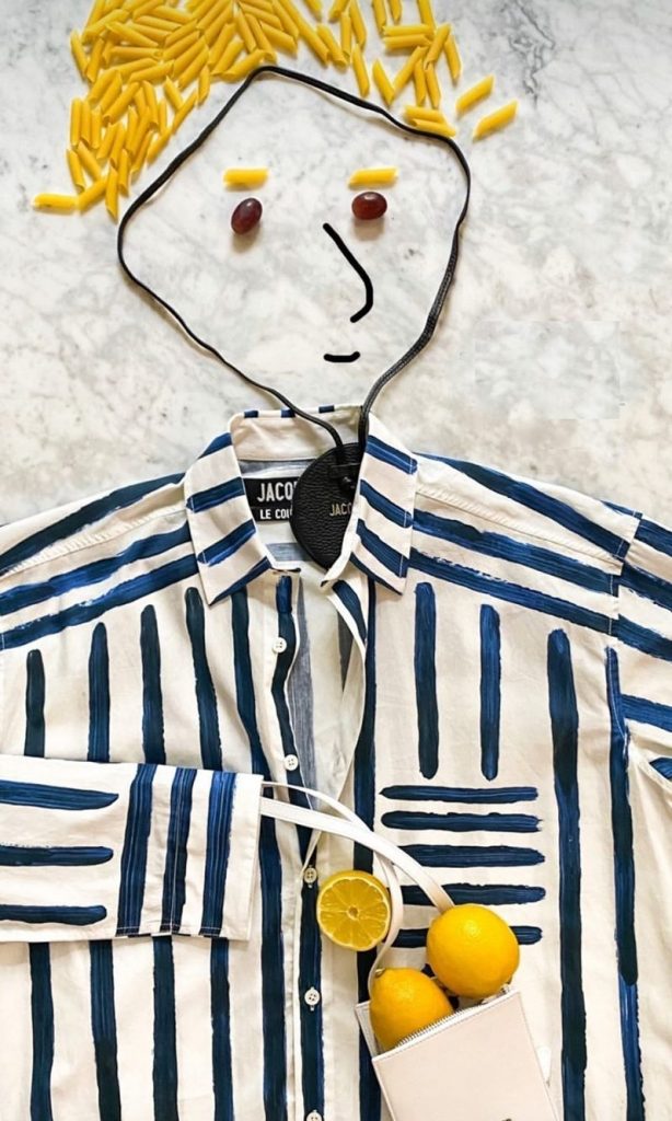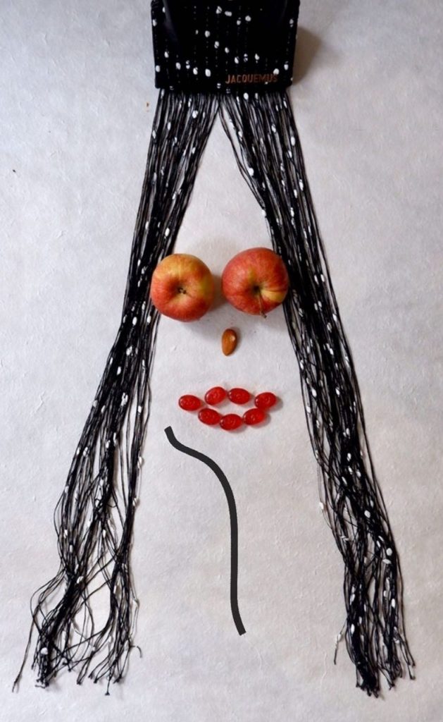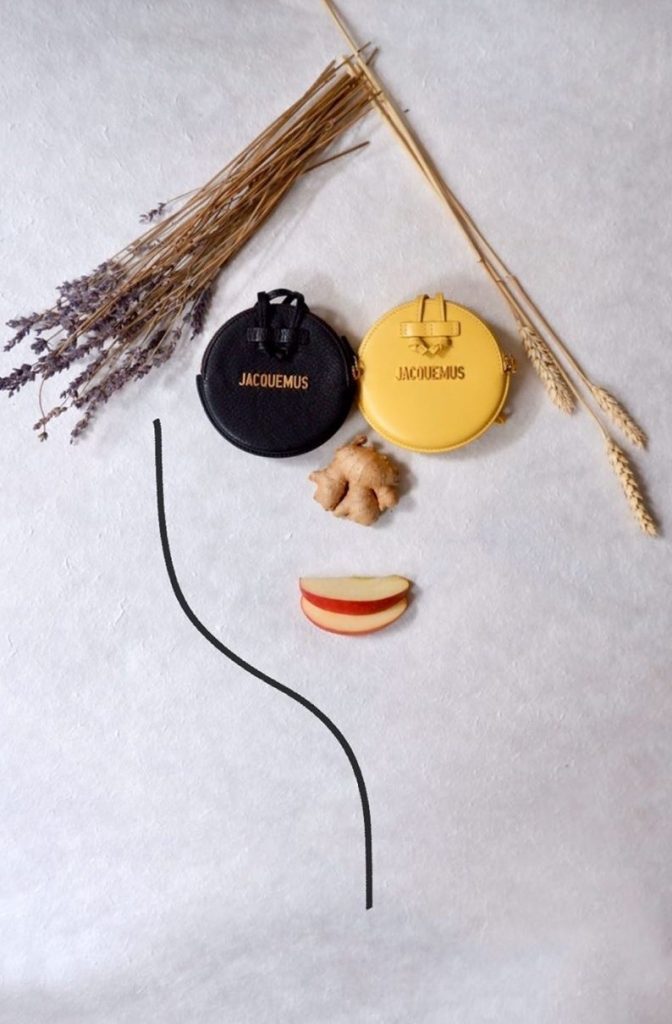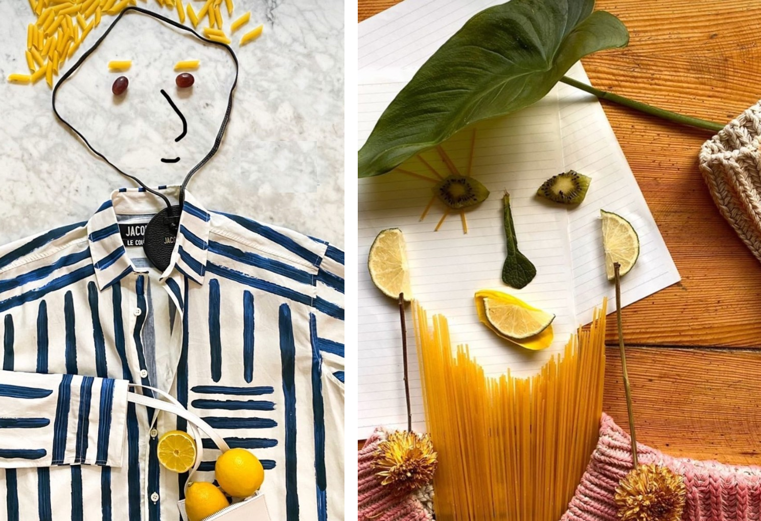 11. Someone decided to go shopping! An artfully placed sleeve holds a clutch, which has a bunch of lemons it. This mysterious lemon man has grapes for eyes, a friendly smile, and a head made from Jacquemus string. The marble background makes it even more chic.
