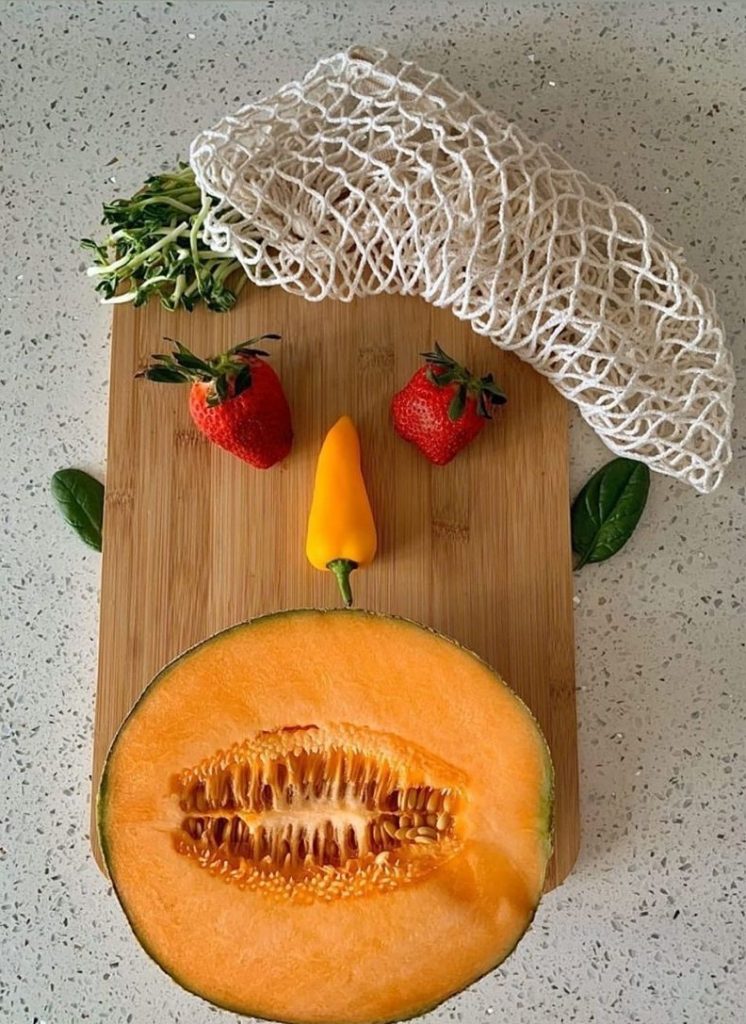 13. Someone decided to get fruity on this cutting board face with a cut open cantaloupe for a mouth – look at those perfect teeth! A yellow mini bell pepper kind of matches that color palette, while strawberries signify eyes.