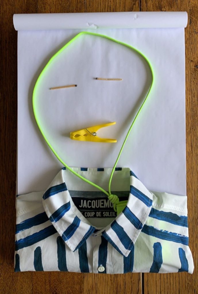 3. For Jacquemus’s final look, he got extra creative and used one of his very own shirts (which we now want immediately.) Some bone structure is made from a neon lanyard, while eyes are narrow due to matches. The lips are a laundry pin, and we want a video with a talking edition.
