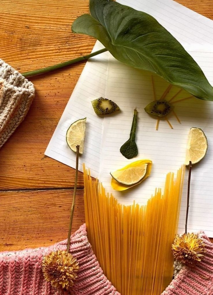 7. Not sure if the spaghetti is meant to be a neck or a beard for this look, but we love it either way. Kiwis for eyes are so beautiful, but the sun won’t ruin them thanks to a big shady leaf for hair. Citrus makes up the eyes and mouth, while an artfully cut leaf makes for a bulb nose.
