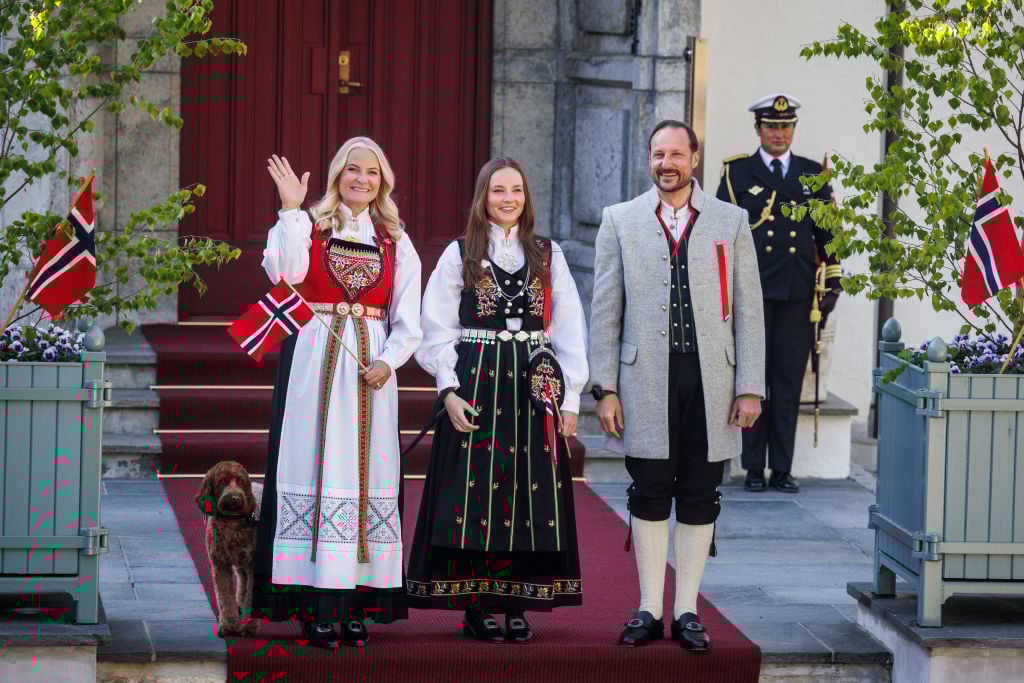 OSLO, NORWAY – MAY 17: (L-R) Crown Princess Mette Marit, Princess Ingrid Alexandra and Crown Prince Haakon Magnus greet the children’s parade at their residence Skaugum in Asker, during the Norwegian National Day on May 17, 2024 in Oslo, Norway. (Photo by Per Ole Hagen/Getty Images)