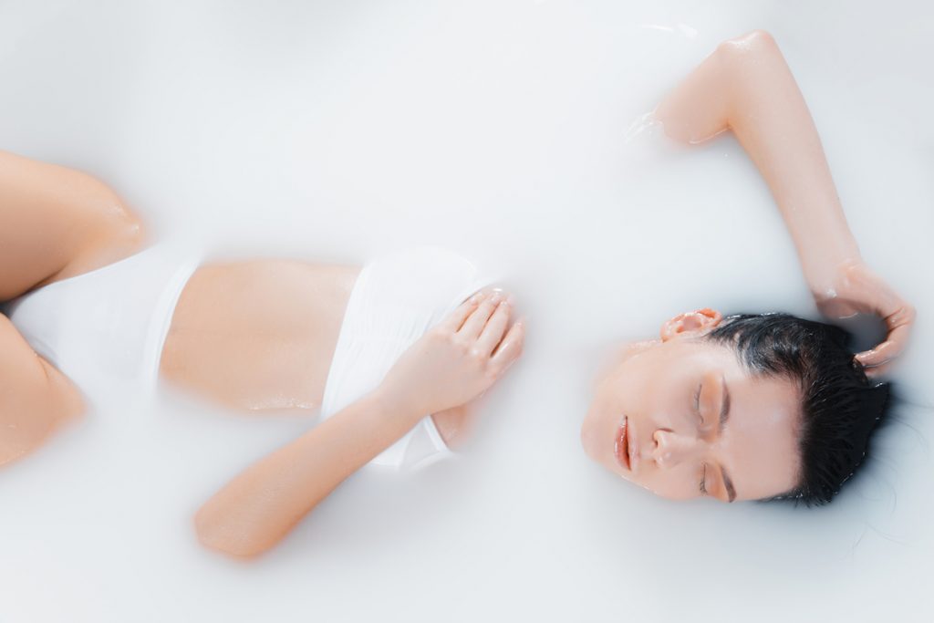 Milk baths contain several compounds that help to replenish moisture, such as lactic acid (a natural exfoliant), vitamins, minerals, and proteins, and fats, which can help soothe and soften skin.