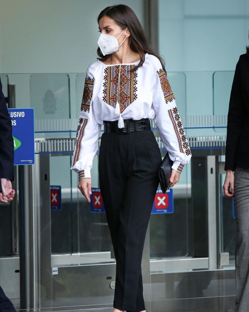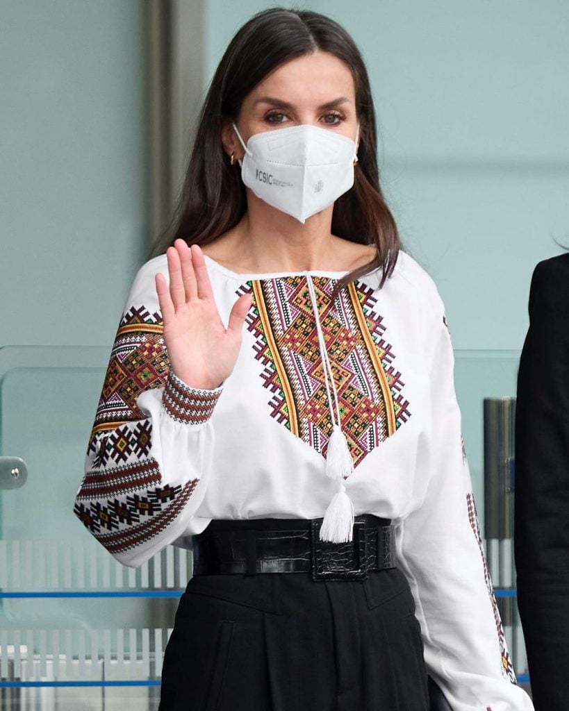 Making a strong humanitarian statement, Queen Letizia wore a vyshyvanka. This is a traditional embroidered blouse that’s often worn by Ukrainian people. The Spanish queen paired it with black pants and heels. She wore the look to a ceremony at the Mutua Madrileña Foundation in Madrid. Spain is one of the 141 of the United Nations to condemn this Russian invasion.