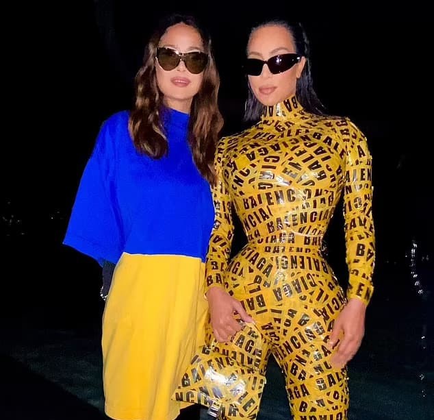 In a photo posing with Kim Kardashian during Paris Fashion Week, Salma Hayek wore an oversized tunic that was blue on the top and yellow on the bottom. It’s worth commending Salma for wearing this modest show of humanitarian advocacy when she could have just worn an attention-grabbing look intended for the paparazzi like her buddy Kim.