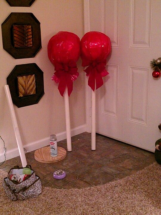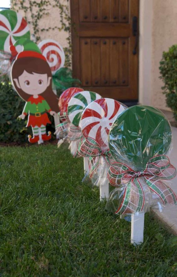 To create this easy front yard design, use paper plates glued together and draw red and green polka dots in marker or paint. Cover with cellophane and stake it into the ground with a stick, tying it off with a ribbon to really maximize that Christmas look. Instead of a giant plate, you can also use a cellophane-wrapped yoga ball for an added 3D aspect.