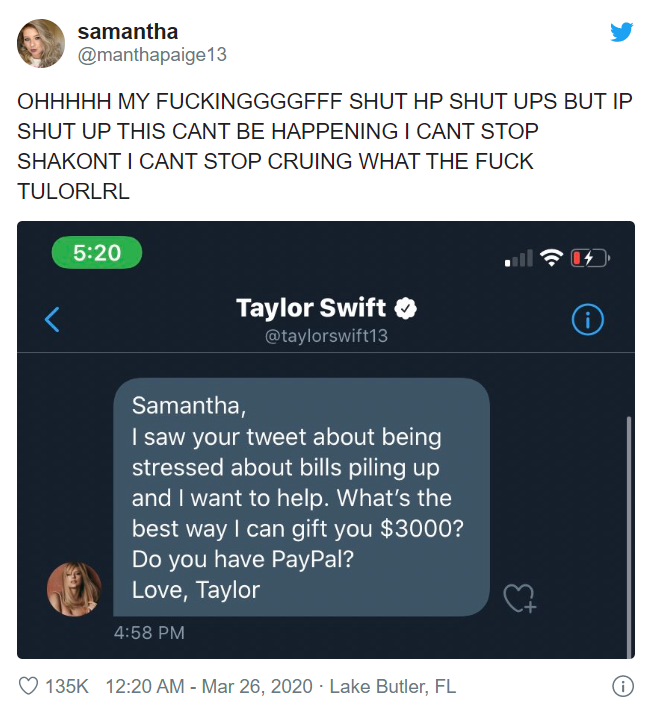 COVID-19 has brought a wave of international unemployment for many, who are forced to stay home when they badly need a pay check. Not everyone will have a job guaranteed for them when this is over, and we need all the compassion, kindness, and help that we can possibly give to others. It looks like Taylor is a beacon of that generous and positive spirit during this tough time.