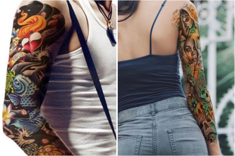 There is such a thing as temporary sleeve tattoos. You can get sleeve sized transfer tattoos, but you have to be really careful with applying them since the area is much bigger and therefore it’s much easier to miss a spot when transferring. It’s also important to remember that since the transfer tattoo is essentially a thin film on top of your skin it will damage and wrinkle faster in the areas that move a lot like elbows and wrists, where the skin stretches and moves a lot.