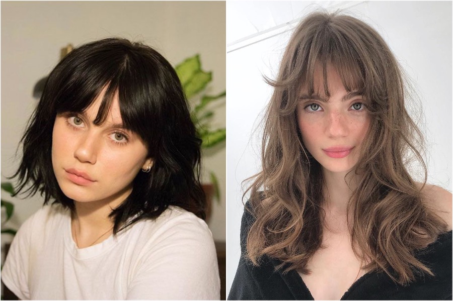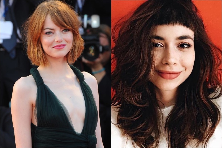 Heart-shaped faces are generally wider at the top, with a bigger forehead, nice cheekbones and a small, sometimes pointed chin. The 70s inspired bangs that are long and feathery on the sides and shorter in the middle are a great option for those who want to even out their face shape and make it look more oval, plus these bangs are super in trend right now. Alternatively, you can also go for baby bangs (not to be mistaken for micro bangs). Baby bangs are on the shorter side, and usually are thinner and more feathery rather than blunt.