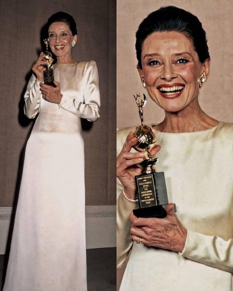 3. Here’s Audrey in 1990 winning a Golden Globe for her Outstanding Contributions to the World of Entertainment. A classy cream dress is absolutely perfect for that kind of event and that kind of award.