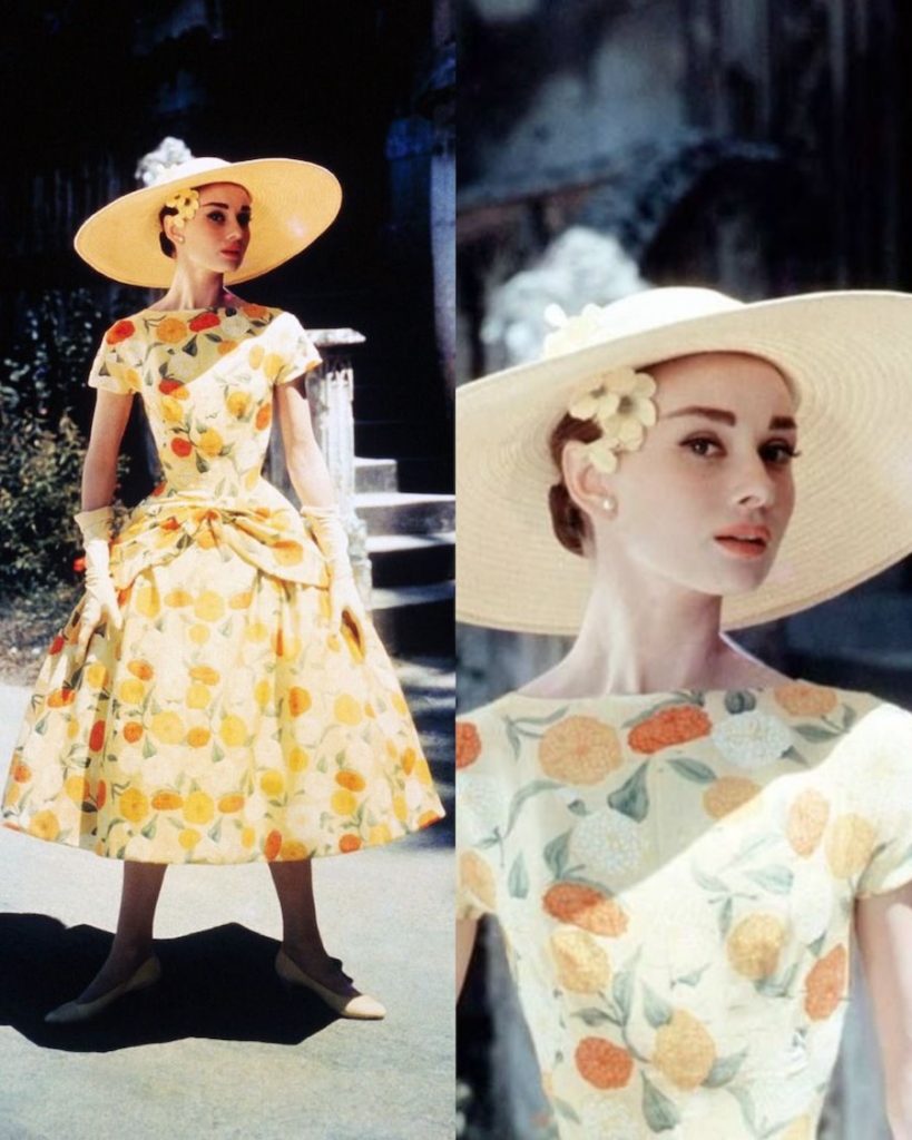5. A yellow and orange dress with floral motives, not exactly something you would imagine Audrey wearing, but this is what she wore on the set of Funny Face and she made that dress look absolutely swoon-worthy. After all, Givenchy would make a dress that looked anything less than fabulous.