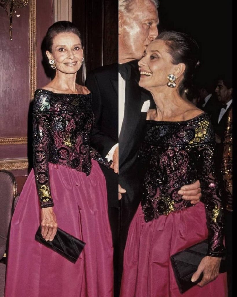 8. Audrey is one of those women who aged so gracefully. It seems like she stayed the same size all the time and even in her later years she still looked incredible in a dress with open shoulders and a bodice that hugged her waist like a second skin. And the pink skirt ads a whimsical element to this too, classic Audrey.