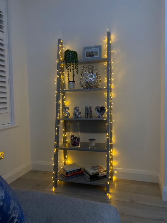 If your bulbs are a bit larger, you can take a ladder and make a horizontal chandelier, hanging lights off the side framing and the shelves. You can also add just branches and wrap the lights around them too. This can be done with smaller bulbs as well — just wrap a larger quantity of them around the ladder for an equally striking effect. You can also do this to brighten up a dark corner.
