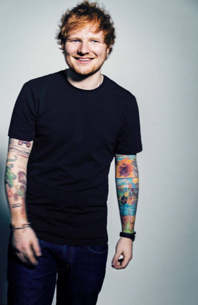 Ed Sheeran loves tattoos. He is covered in ink, with full arm sleeves and tattoos from his neck to stomach. To commemorate his love for “Fresh Prince of Bel Air,” Sheeran has a tattoo of the word “prince” on his arm. He also has two tattoos that are British motifs: a label from a Heinz bottle of ketchup and cup of tea. Another cool tattoo of Sheeran’s is a Teddy bear. This represents his childhood nickname “Teddy,” which rhymes for the long form nickname of his name: Eddy.